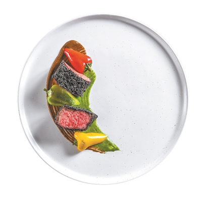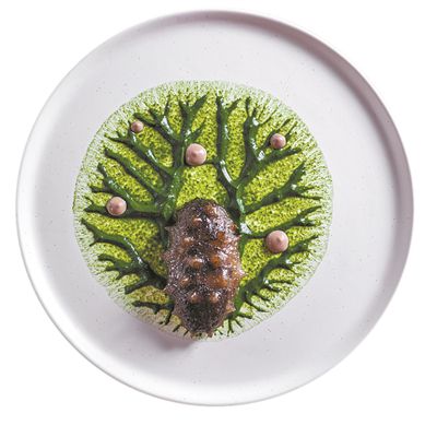 豉椒牛肉也是廣東人餐桌上的常客。Seven選擇用西方的牛扒來承載這傳統而有共鳴的味道。先將豆豉打碎,再混入面包糠來平衡其強烈的風味,再加入帕瑪氏芝士來把所有味道串起來。這時的豉椒口味,豉香溫和不搶戲,形神俱佳,可以讓來自世界各地的食客都能輕易接受這種國際化的粵菜風味。“瘋狂的石頭”是一道以假亂真的佳肴,Seven將廣東的經典涼菜白云鳳爪完全拆解重組,在咬開一刻,脆彈的墨魚汁皮凍能夠讓口腔感受到其柔軟的彈性。內餡則是去骨的鳳爪,包裹著甜酸爽口的凍汁,清新解膩。這道菜須用手拿起“石頭”去吃,因為除味覺以外,手部觸碰食材得到的溫度與質感,會讓人對眼前的食物認識更為立體而多元。
