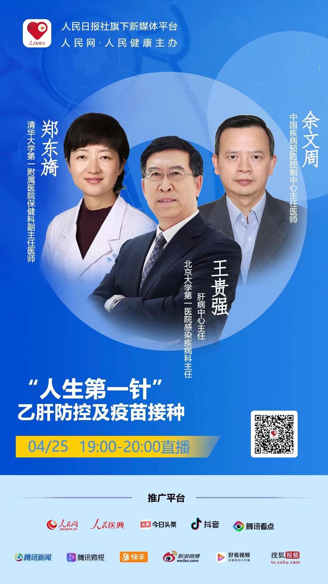 2021年4月25日(周日)19:00-20:00,在第35個全國兒童預防接種日來臨之際,人民日報社旗下新媒體“人民好醫生“將邀請北京大學第一醫院感染疾病科暨肝病中心主任 王貴強、中國疾病預防控制中心免疫規劃中心主任醫師 余文周、清華大學第一附屬醫院副主任醫師 鄭東旖做客演播室,向公眾科普乙肝疾病及疫苗接種相關知識,幫助廣大新手父母解答兒童接種乙肝疫苗的日常疑問,提高對科學接種疫苗的重視,保護兒童健康成長。歡迎大家前來收看提問。
