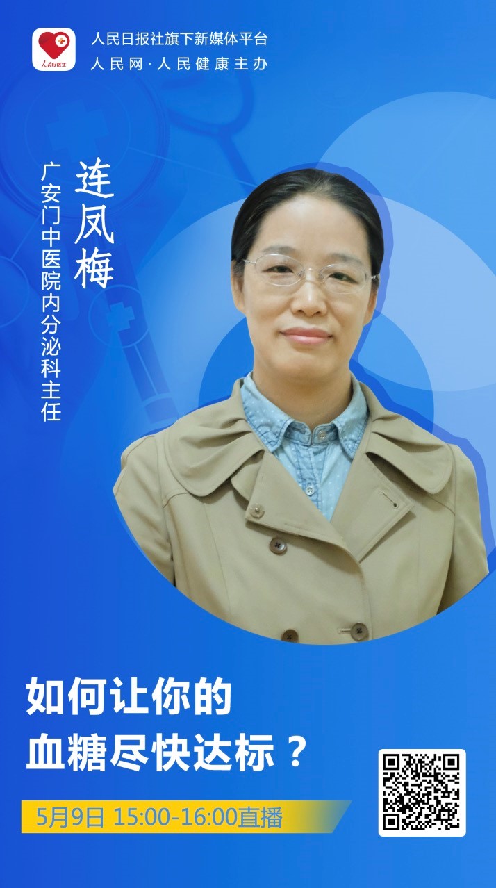2021年5月9日(周日)15:00-16:00,廣安門中醫院內分泌科主任連鳳梅將做客人民日報社旗下新媒體“人民好醫生”客戶端,就 “如何讓你的血糖盡快達標?”的話題與您進行分享。