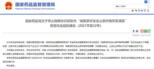 國家藥監局:“瑞果茶籽寶寶山茶籽植萃茶清霜”為假冒化妝品 立即停止銷售