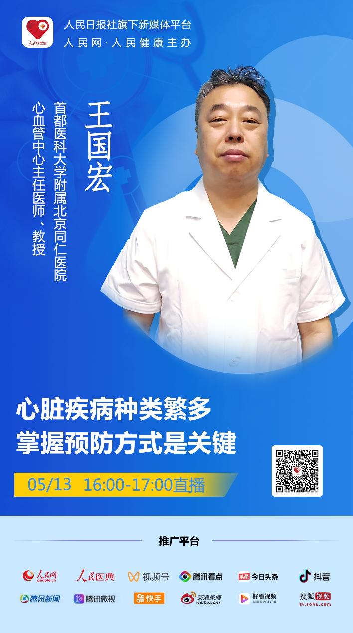 5月13日16:00至17:00,人民日報旗下新媒體“人民好醫生”客戶端將邀請首都醫科大學附屬北京同仁醫院心血管中心主任醫師、教授王國宏進行視頻科普訪談,歡迎屆時收看。