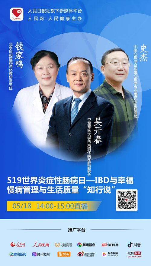 5月18日星期二14:00至15:00,人民日報社旗下新媒體平臺“人民好醫(yī)生”將邀請空軍軍醫(yī)大學西京消化病醫(yī)院副院長吳開春、北京協(xié)和醫(yī)院消化教研室主任錢家鳴、中國心理學會軍事心理學專業(yè)委員會主任委員史杰做客演播室,為大眾普及炎癥性腸病的慢病管理相關(guān)科普知識,千萬不要錯過。