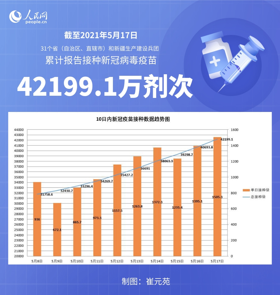 人民網北京5月18日電 (記者崔元苑)據國家衛生健康委官網消息,截至2021年5月17日,31個省(自治區、直轄市)及新疆生產建設兵團累計報告接種新冠病毒疫苗42199.1萬劑次。17日單日接種新冠病毒疫苗1505.3萬劑次。