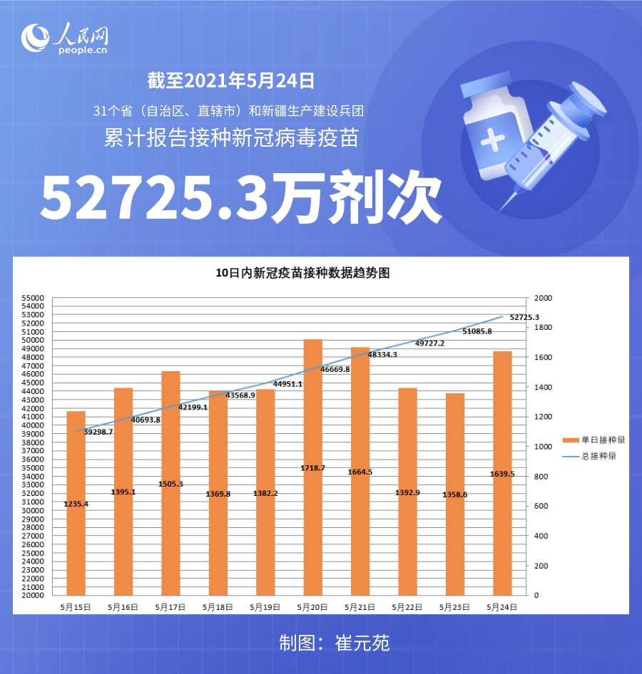人民網北京5月25日電 (記者崔元苑)據國家衛生健康委官網消息,截至2021年5月24日,31個省(區、市)及新疆生產建設兵團累計報告接種新冠病毒疫苗52725.3萬劑次。