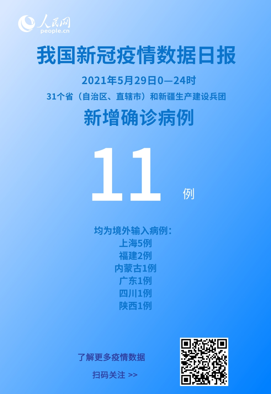 人民網北京5月30日電 (記者崔元苑)今日,國家衛生健康委于官網發布了截至5月29日24時新型冠狀病毒肺炎疫情最新情況。5月29日0—24時,31個省(自治區、直轄市)和新疆生產建設兵團報告新增確診病例11例,均為境外輸入病例(上海5例,福建2例,內蒙古1例,廣東1例,四川1例,陜西1例);無新增死亡病例;無新增疑似病例。