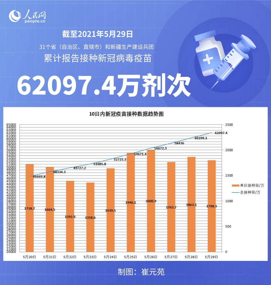 人民網北京5月30日電 (記者崔元苑)據國家衛生健康委官網消息,截至2021年5月29日,31個省(自治區、直轄市)和新疆生產建設兵團累計報告接種新冠病毒疫苗62097.4萬劑次。