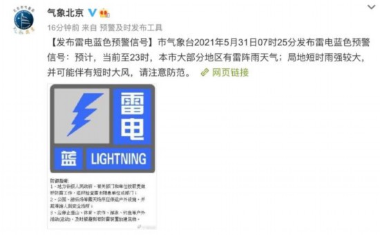 圖為北京發(fā)布雷電藍(lán)色預(yù)警。 氣象北京微博截圖