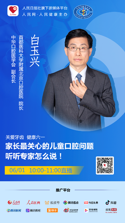 6月1日10:00至11:00,邀請(qǐng)到首都醫(yī)科大學(xué)附屬北京口腔醫(yī)院院長(zhǎng),中華口腔醫(yī)學(xué)會(huì)副會(huì)長(zhǎng)白玉興做客人民好醫(yī)生名醫(yī)直播欄目,探討兒童口腔常見的問題,給公眾科普兒童口腔問題的相關(guān)知識(shí)。