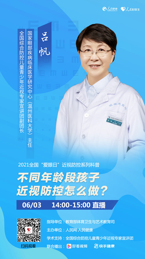 6月3日(周四)下午14:00-15:00,國家眼部疾病臨床醫學研究中心(溫州醫科大學)主任、全國綜合防控兒童青少年近視專家宣講團副團長呂帆將做客人民日報社旗下新媒體“人民好醫生”客戶端,就“不同年齡段孩子近視防控怎么做?” 相關話題進行在線分享,歡迎屆時收看。