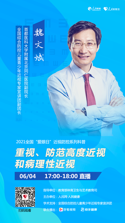 6月4日(周五)下午17:00至18:00,首都醫科大學附屬北京同仁醫院副院長、全國綜合防控兒童青少年近視專家宣講團副團長魏文斌將做客人民日報社旗下新媒體“人民好醫生”客戶端,就“重視、防范高度近視和病理性近視”相關話題進行在線分享,歡迎屆時收看。