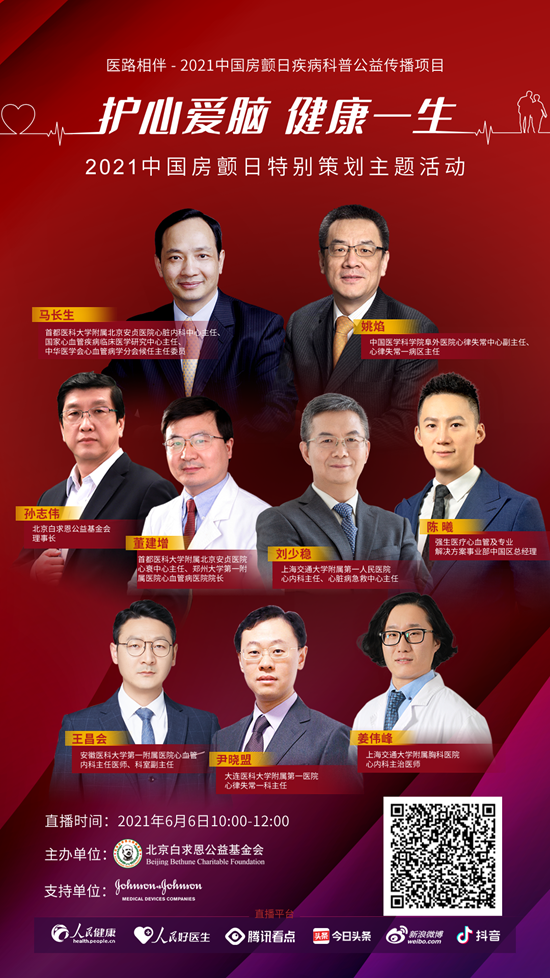 6月6日是第九個“中國房顫日”。據悉,北京白求恩公益基金會聯合強生(上海)醫療器材有限公司(以下簡稱:強生醫療)近期啟動了“醫路相伴”——2021中國房顫日疾病科普公益傳播項目,并計劃在6月6日當天推出“護心愛腦 健康一生”——2021中國房顫日特別策劃主題活動,進一步拉近醫患距離,提升公眾對房顫這一疾病和包括射頻消融手術在內的創新臨床解決方案的認知水平,推動房顫的早診、早治和規范化診療。