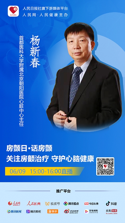 6月9日(周三)15:00至16:00,人民日報(bào)社旗下新媒體“人民好醫(yī)生”客戶端將邀請首都醫(yī)科大學(xué)附屬北京朝陽醫(yī)院心臟中心主任楊新春做客直播間,就房顫的抗凝治療的相關(guān)內(nèi)容進(jìn)行科普直播,歡迎收看。