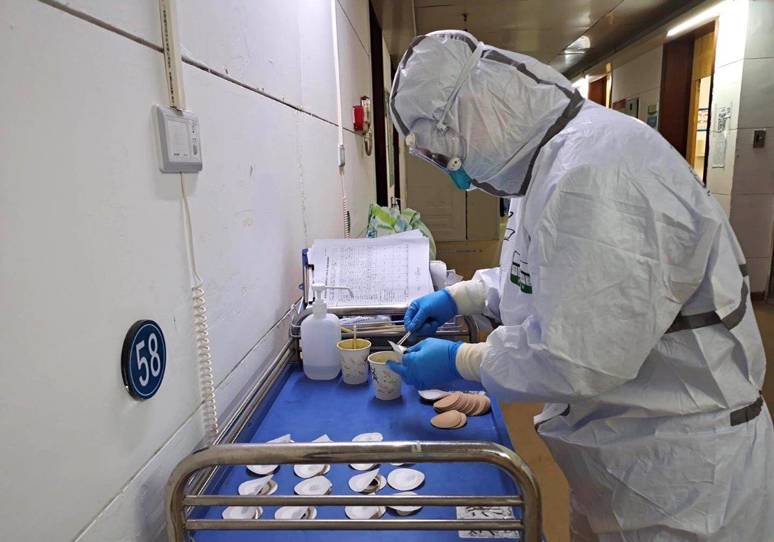 2020年2月11日,廣東省中醫(yī)院醫(yī)療隊隊員在為患者進行中藥穴位敷貼做準備工作。新華社發(fā)(廣東省中醫(yī)院援助湖北醫(yī)療隊供圖)