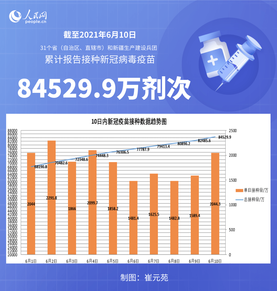 人民網北京6月11日電 (記者崔元苑)據國家衛生健康委官網消息,截至2021年6月10日,31個省(自治區、直轄市)和新疆生產建設兵團累計報告接種新冠病毒疫苗84529.9萬劑次。