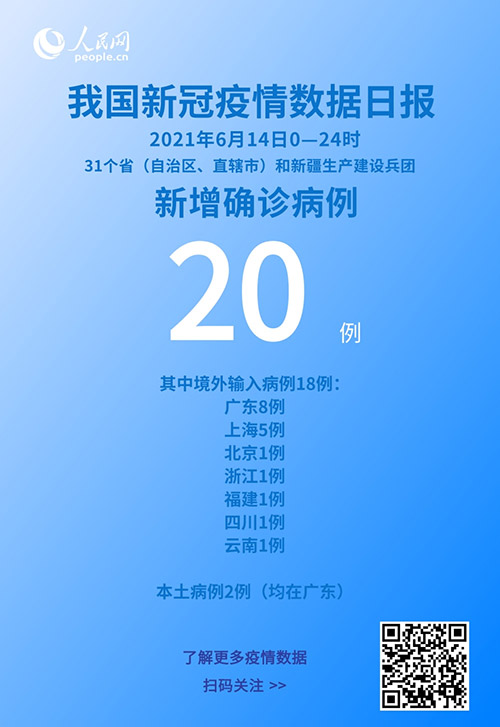 人民網北京6月15日電 (記者孫紅麗)今日,國家衛(wèi)生健康委于官網發(fā)布了截至6月14日24時新型冠狀病毒肺炎疫情最新情況。6月14日0—24時,31個省(自治區(qū)、直轄市)和新疆生產建設兵團報告新增確診病例20例,其中境外輸入病例18例(廣東8例,上海5例,北京1例,浙江1例,福建1例,四川1例,云南1例),本土病例2例(均在廣東);無新增死亡病例;無新增疑似病例。