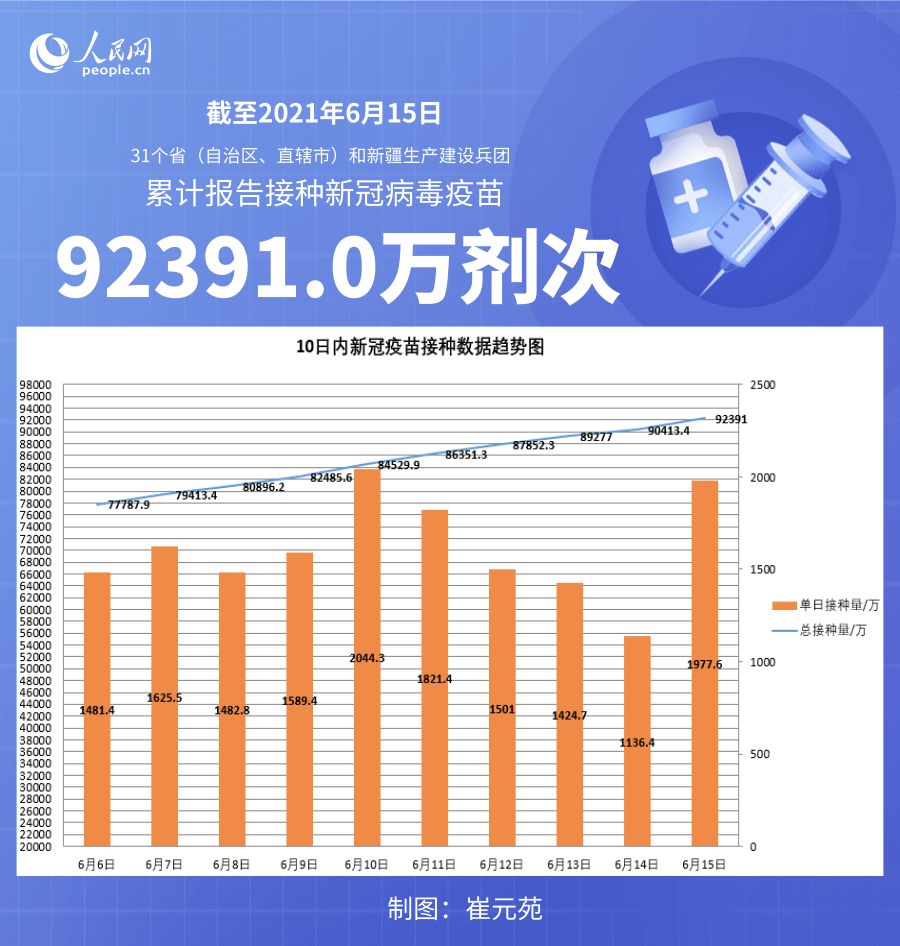人民網北京6月16日電 (記者崔元苑)據國家衛生健康委官網消息,截至2021年6月15日,31個省(自治區、直轄市)和新疆生產建設兵團累計報告接種新冠病毒疫苗92391.0萬劑次。