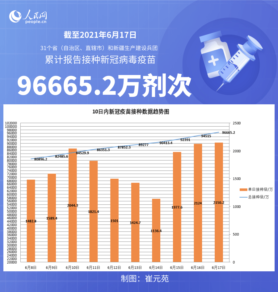 人民網北京6月18日電 (記者崔元苑)據國家衛生健康委官網消息,截至2021年6月17日,31個省(自治區、直轄市)和新疆生產建設兵團累計報告接種新冠病毒疫苗96665.2萬劑次。