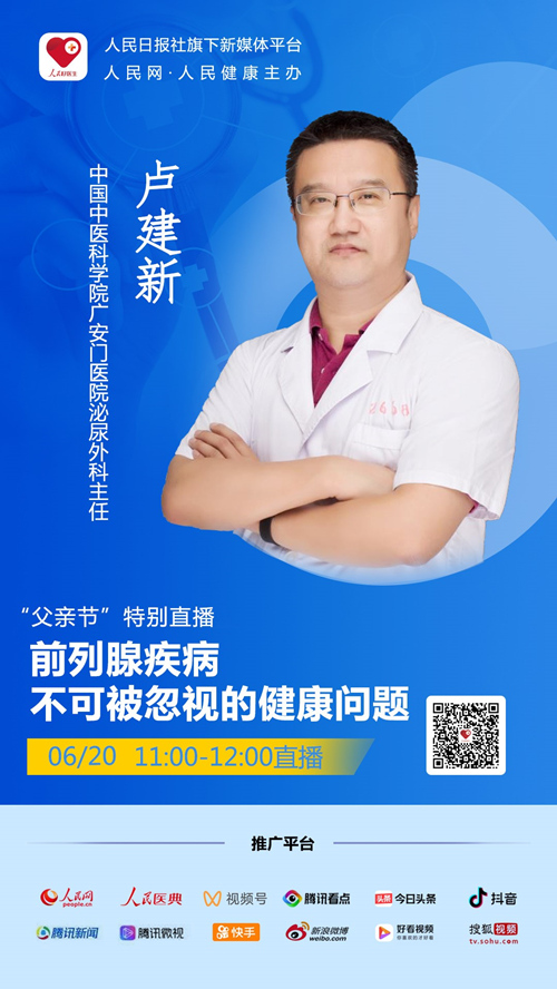 6月20日11:00-12:00,人民日報社旗下新媒體客戶端“人民好醫生”將邀請中國中醫科學院廣安門醫院泌尿外科主任盧建新做客直播間,和大家分享關于前列腺健康的科普內容,歡迎大家收看!