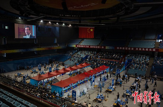 3月27日,北京大學邱德拔體育館內,新冠疫苗集中接種現場。現場共設置6個接種工作區,包括測溫區、知情同意書簽訂及健康問詢區、信息登記區、疫苗接種區、留置觀察及應急處置區、供物資儲存冷鏈區。隨著學生返京返校,首都高校進入疫苗全面接種期。 中青報·中青網記者 李雋輝/攝