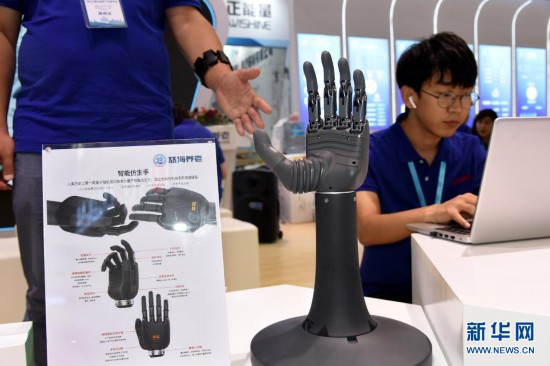 7月3日,一家參展商在展會上展示一款量產(chǎn)版“智能仿生手”。