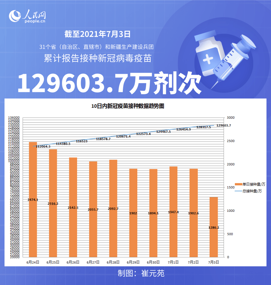 人民網北京7月4日電 (記者崔元苑)據國家衛生健康委官網消息,截至2021年7月3日,31個。ㄗ灾螀^、直轄市)和新疆生產建設兵團累計報告接種新冠病毒疫苗129603.7萬劑次。