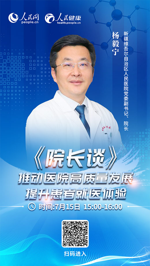 7月15日15:00-16:00,《院長(zhǎng)談》專(zhuān)欄將邀請(qǐng)新疆維吾爾自治區(qū)人民醫(yī)院黨委副書(shū)記、院長(zhǎng)楊毅寧做客演播室,就“推動(dòng)醫(yī)院高質(zhì)量發(fā)展 提升患者就醫(yī)體驗(yàn)”話(huà)題與網(wǎng)友在線交流。