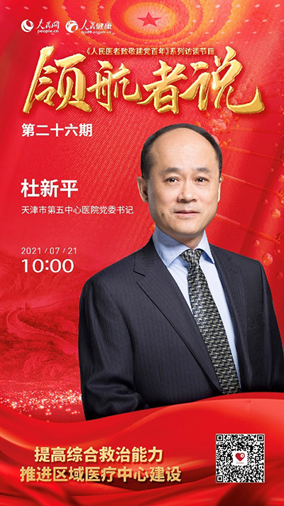 2021年7月21日 10:00,天津市第五中心醫院黨委書記杜新平做客演播室,以“提高綜合救治能力 推進區域醫療中心建設”為主題進行訪談。