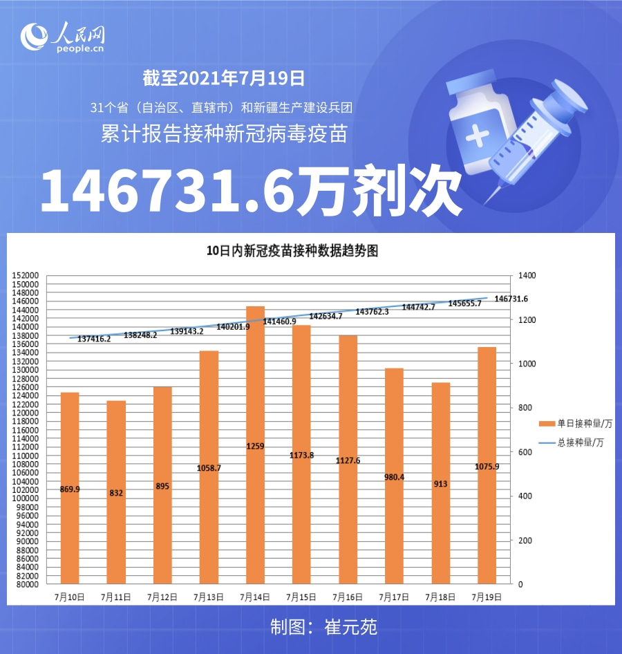 人民網北京7月20日電 (記者崔元苑)據國家衛生健康委官網消息,截至2021年7月19日,31個省(自治區、直轄市)和新疆生產建設兵團累計報告接種新冠病毒疫苗146731.6萬劑次。