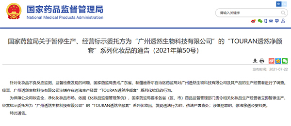 國家藥監局:“TOURAN透然凈顏套”系列化妝品暫停生產經營