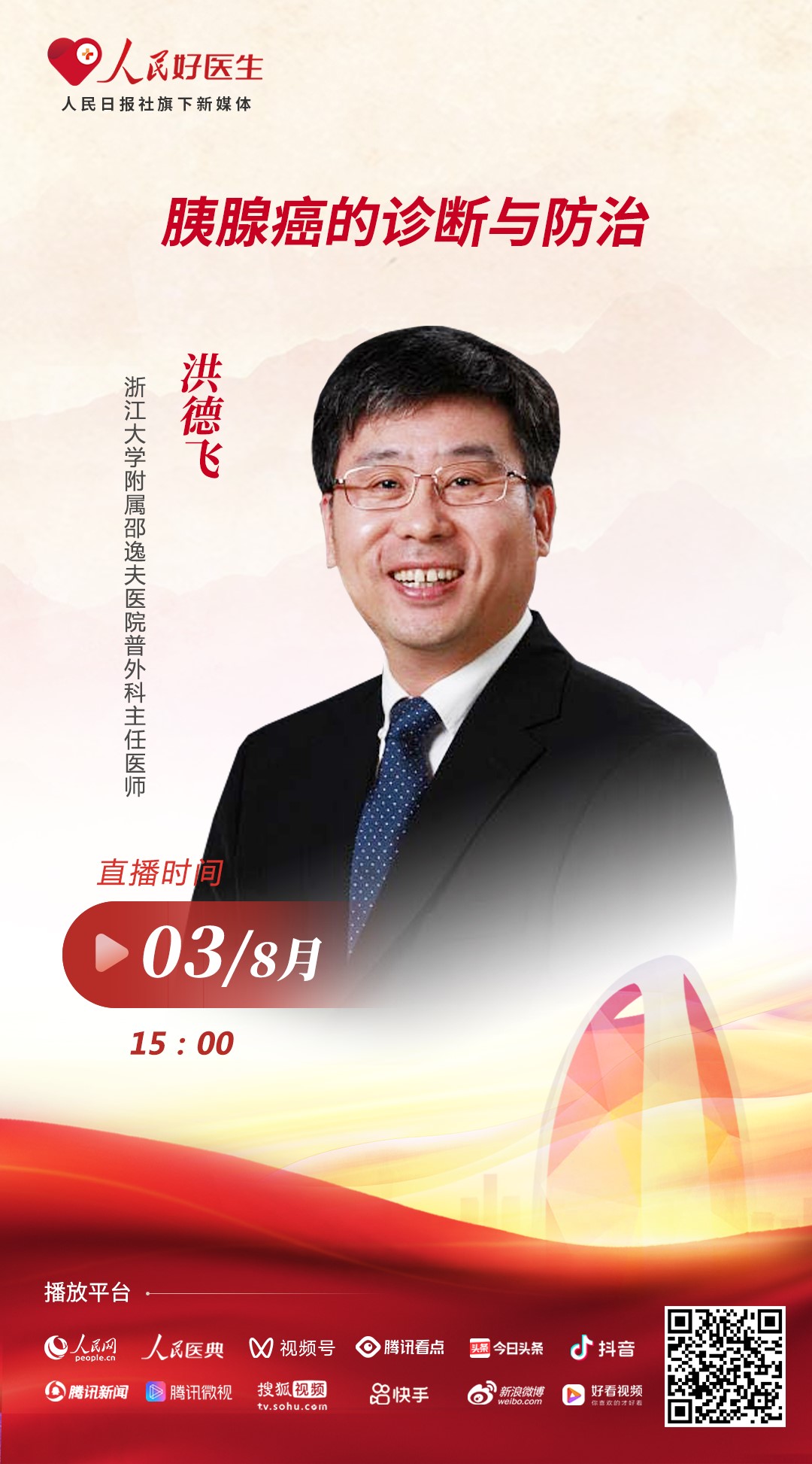 8月3日15:00,浙江大學(xué)附屬邵逸夫醫(yī)院普外科主任醫(yī)師洪德飛將做客人民日?qǐng)?bào)社旗下新媒體“人民好醫(yī)生”客戶端,就“胰腺癌的診斷與防治”為大眾答疑解惑。