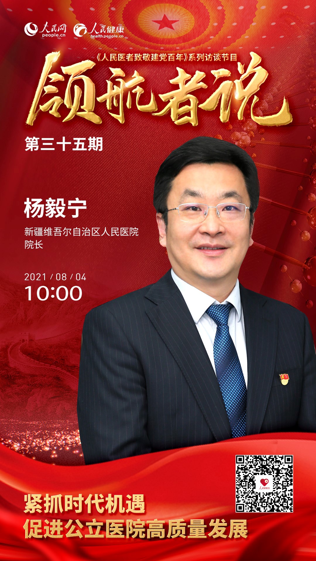 8月4日10:00,新疆維吾爾自治區人民醫院院長楊毅寧將作客演播室,以“緊抓時代機遇 促進公立醫院高質量發展”為題進行訪談。