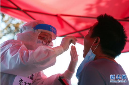 8月2日,在鄭州市鄭東新區一個核酸檢測點,醫務人員為市民進行核酸檢測取樣。
