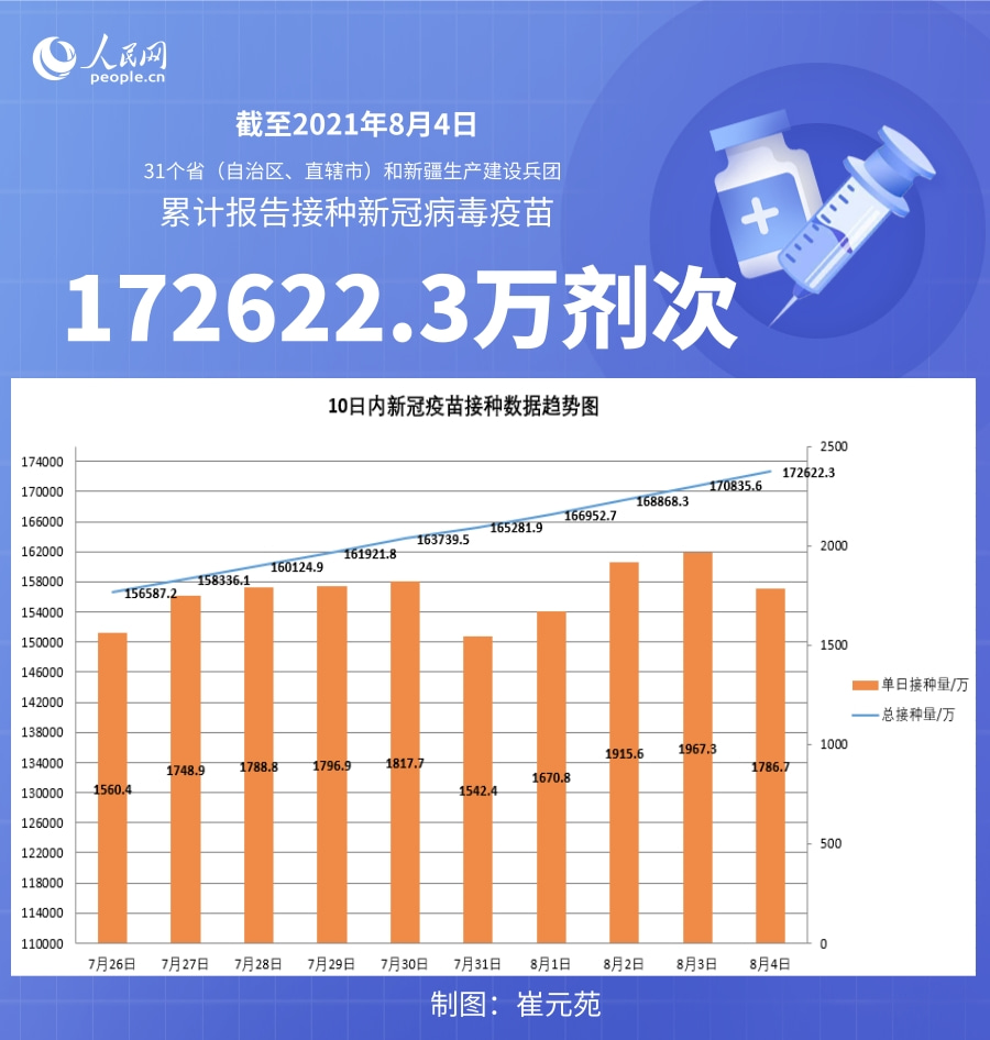 人民網北京8月5日電 (記者崔元苑)據國家衛生健康委官網消息,截至2021年8月4日,31個省(自治區、直轄市)和新疆生產建設兵團累計報告接種新冠病毒疫苗172622.3萬劑次。