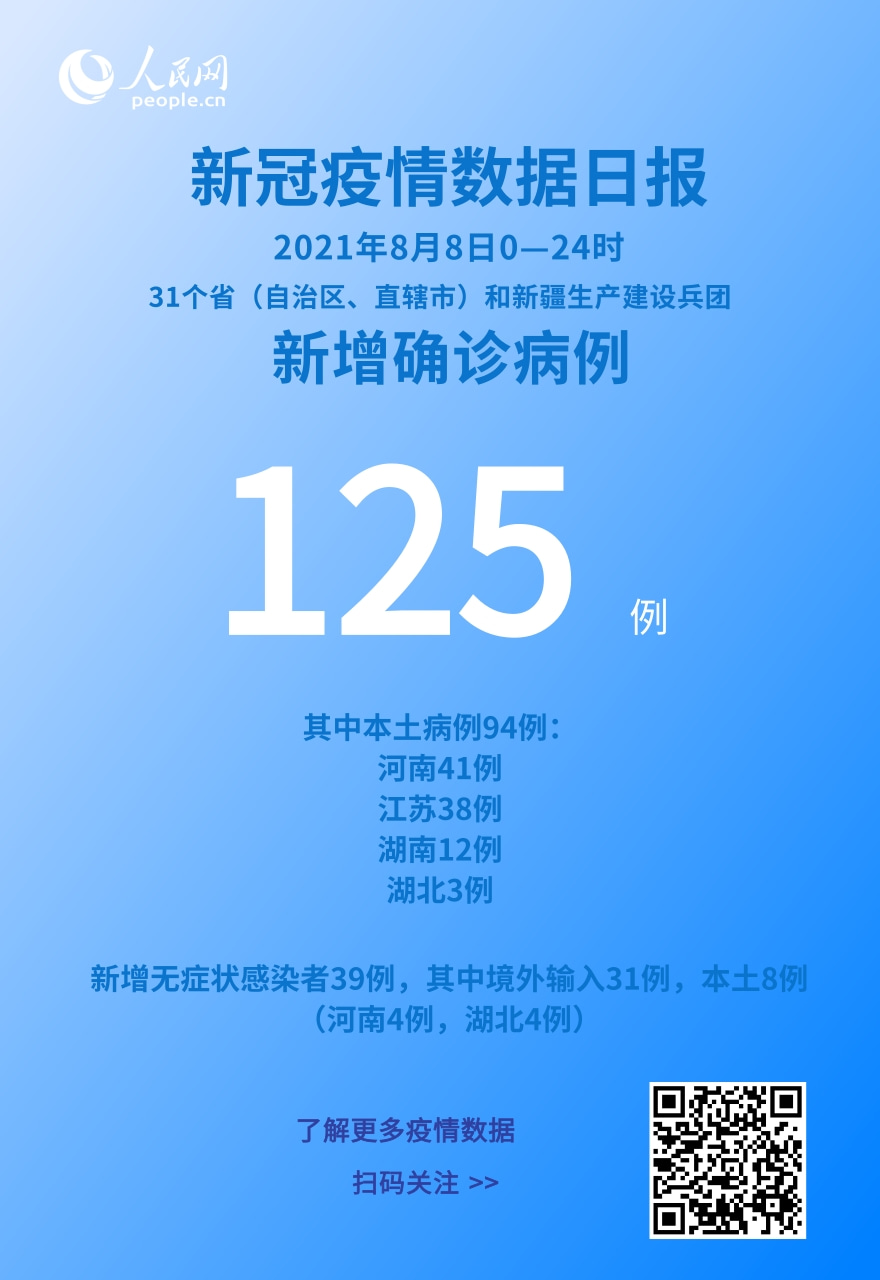 人民網北京8月9日電 (記者崔元苑)今日,國家衛生健康委于官網發布了截至8月8日24時新型冠狀病毒肺炎疫情最新情況。8月8日0—24時,31個省(自治區、直轄市)和新疆生產建設兵團報告新增確診病例125例,其中境外輸入病例31例(上海8例,廣東8例,云南8例,北京3例,內蒙古1例,浙江1例,四川1例,陜西1例),本土病例94例(河南41例,江蘇38例,湖南12例,湖北3例);無新增死亡病例;無新增疑似病例。