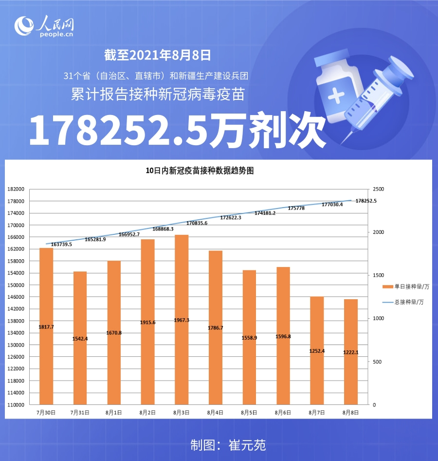 人民網北京8月9日電 (記者崔元苑)據國家衛生健康委官網消息,截至2021年8月8日,31個省(自治區、直轄市)和新疆生產建設兵團累計報告接種新冠病毒疫苗178252.5萬劑次。