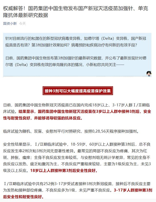 最新!國藥集團中國生物公布研究數據:接種3劑新冠滅活疫苗可大幅提高保護效果