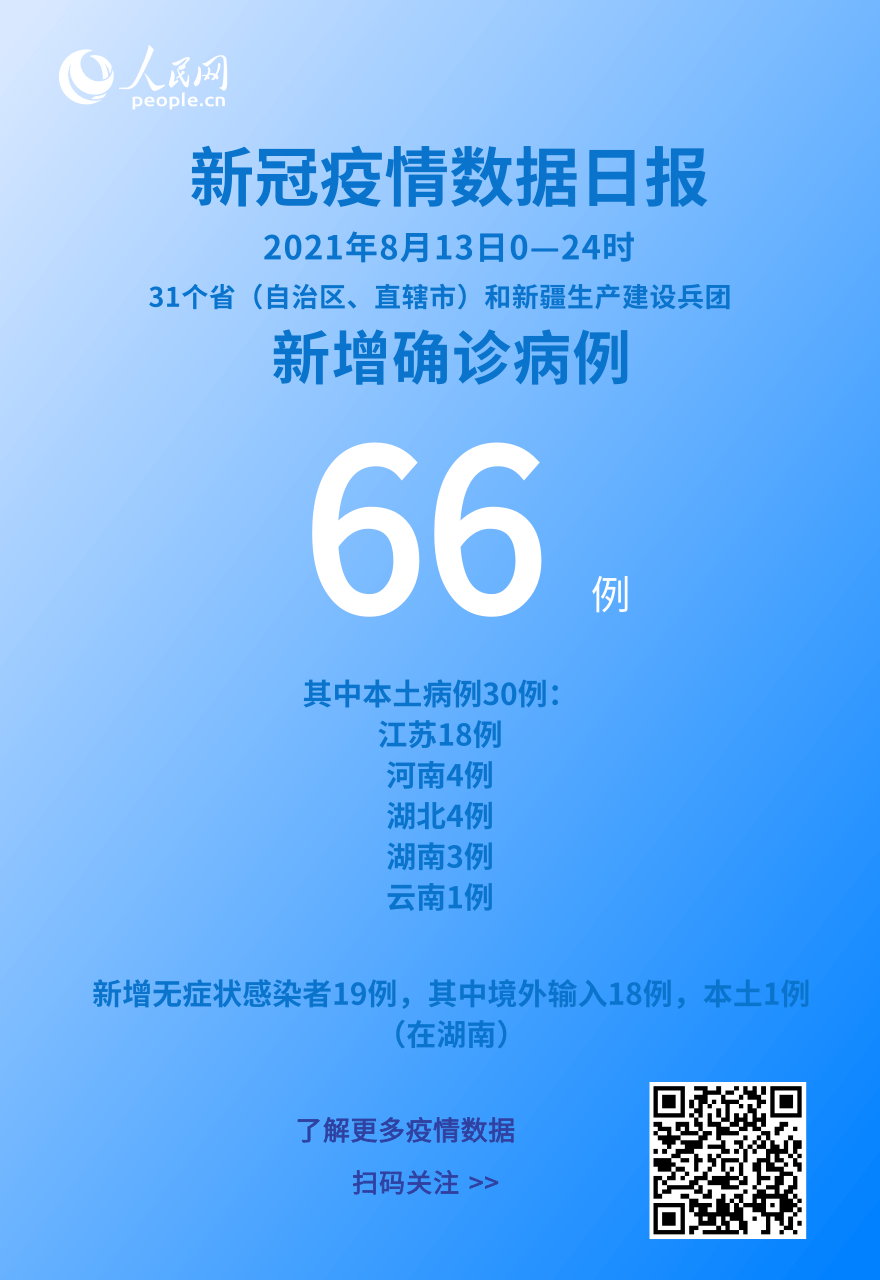 人民網北京8月14日電 (記者崔元苑)今日,國家衛生健康委于官網發布了截至8月13日24時新型冠狀病毒肺炎疫情最新情況。8月13日0—24時,31個省(自治區、直轄市)和新疆生產建設兵團報告新增確診病例66例,其中境外輸入病例36例(福建11例,上海5例,云南5例,山東4例,四川4例,廣東3例,天津2例,遼寧1例,陜西1例),本土病例30例(江蘇18例,河南4例,湖北4例,湖南3例,云南1例);無新增死亡病例;無新增疑似病例。