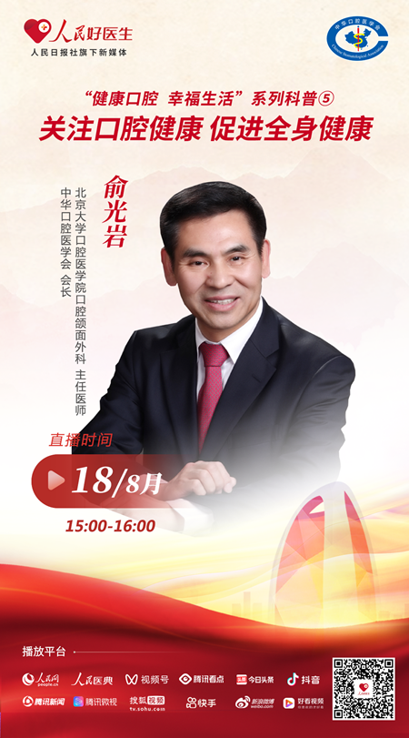 8月18日15:00,中華口腔醫學會會長、北京大學口腔醫學院口腔頜面外科主任醫師俞光巖做客“人民好醫生”客戶端,給公眾科普口腔健康與全身健康的相關知識,歡迎收看。
