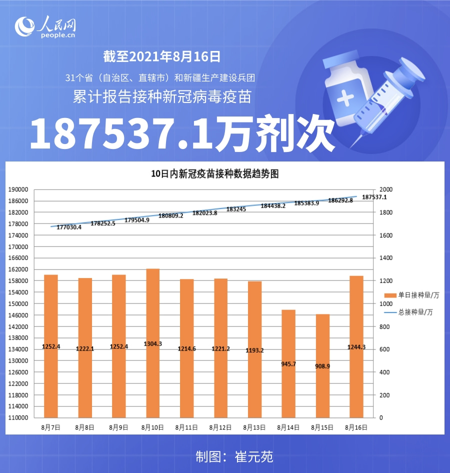 人民網北京8月17日電 (記者崔元苑)據國家衛生健康委官網消息,截至2021年8月16日,31個省(自治區、直轄市)和新疆生產建設兵團累計報告接種新冠病毒疫苗187537.1萬劑次。