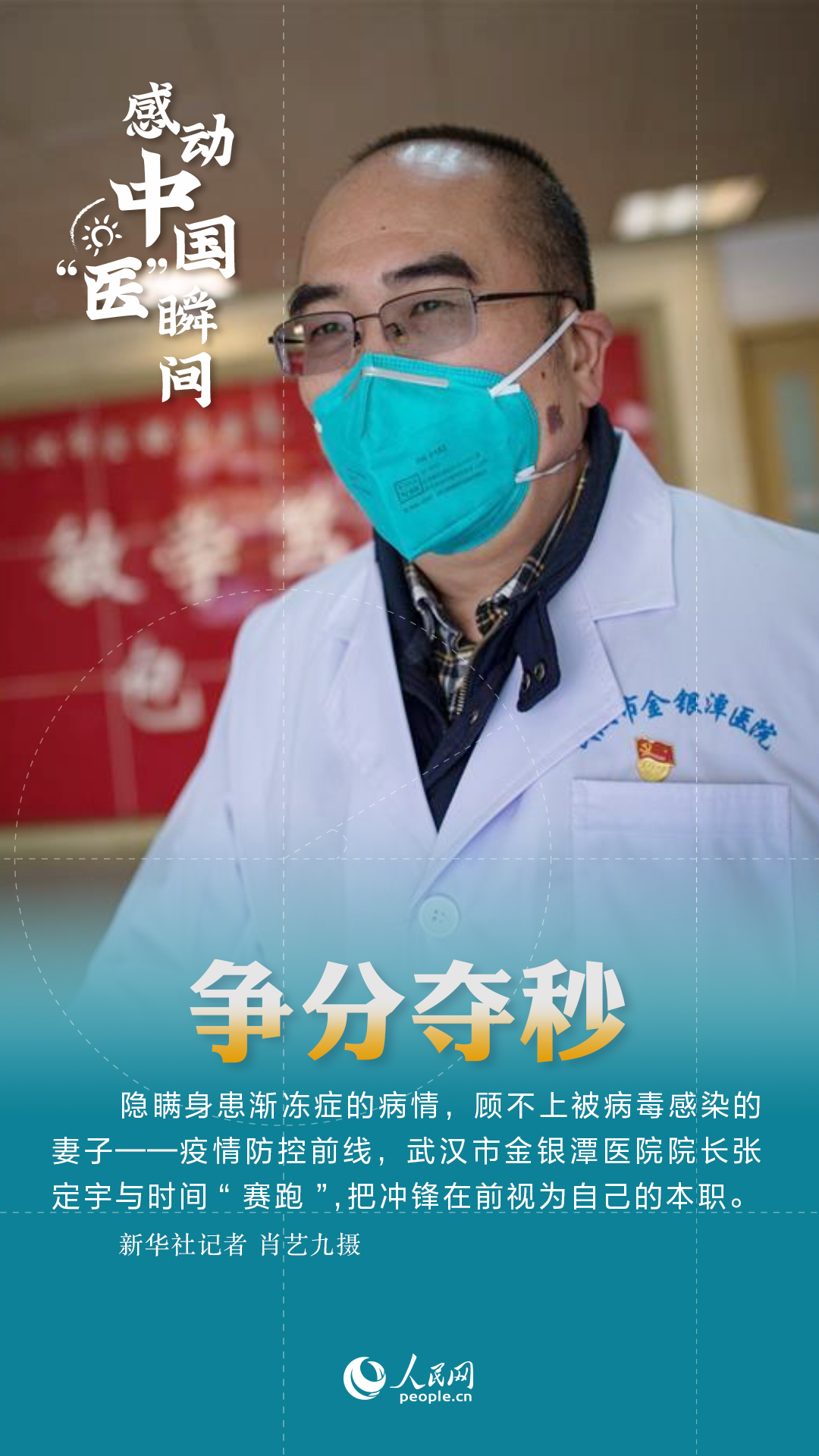 隱瞞身患漸凍癥的病情,顧不上被病毒感染的妻子——疫情防控前線,張定宇與時間“賽跑”,把沖鋒在前視為自己的本職。“我必須跑得更快,才能跑贏時間;我必須跑得更快,才能從病毒手里搶回更多病人。”身患漸凍癥,自身也要面對病痛的折磨,但他的心中,滿滿地裝著的,全是病人。