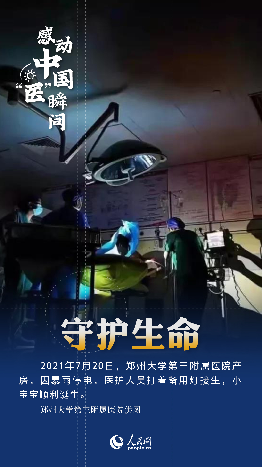 即使只剩下一束光,醫生也會盡全力為你點亮。鄭州大學第三附屬醫院因暴雨停電。昏暗的產房中,醫護全力守護生命,用應急燈完成接生。這束光照亮新生和希望。