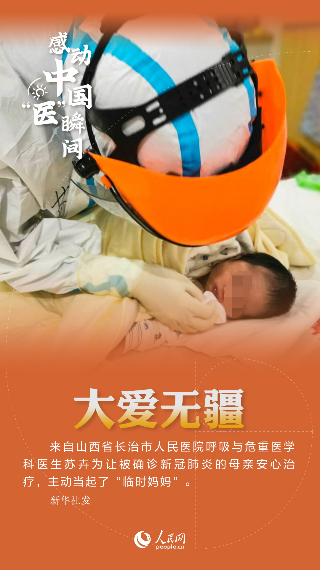 在疾病面前,病人和醫生是牢固的同盟。小女孩點點出生在湖北省潛江市婦幼保健院,由于媽媽被確診新冠肺炎,一家人全部接受隔離,點點也住進了保健院的隔離病房。來自山西省長治市人民醫院呼吸與危重醫學科的醫生蘇卉為了讓孩子的母親安心治療,主動當起了“臨時媽媽”。