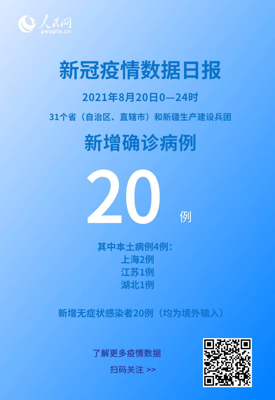 人民網北京8月21日電 (記者崔元苑)今日,國家衛生健康委于官網發布了截至8月20日24時新型冠狀病毒肺炎疫情最新情況。8月20日0—24時,31個省(自治區、直轄市)和新疆生產建設兵團報告新增確診病例20例,其中境外輸入病例16例(廣東4例,云南3例,北京2例,上海2例,浙江2例,天津1例,內蒙古1例,福建1例),本土病例4例(上海2例,江蘇1例,湖北1例);無新增死亡病例;無新增疑似病例。