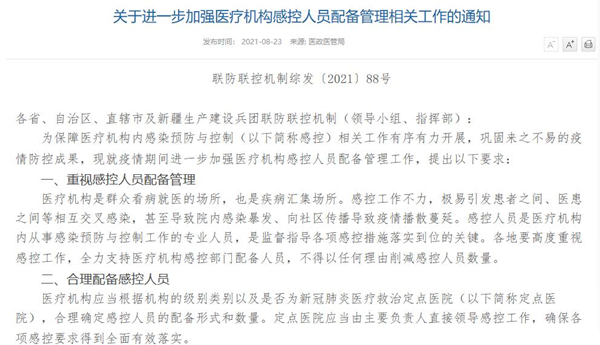 人民網北京8月23日電 (記者張文婷)為保障醫療機構內感染預防與控制相關工作(以下簡稱感控)有序有力開展,鞏固來之不易的疫情防控成果,近日,聯防聯控機制綜合組制定印發了《關于進一步加強醫療機構感控人員配備管理相關工作的通知》(以下簡稱《通知》),從高度重視感控人員配備管理、合理配備感控人員、優化感控人員專業結構、提高感控人員能力水平、落實感控人員職責以及關注感控人員職業發展和薪酬待遇六方面進一步加強疫情期間醫療機構感控人員配備管理工作。