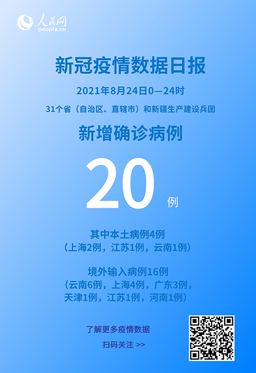 人民網北京8月25日電 (記者孫紅麗)今日,國家衛生健康委于官網發布了截至8月24日24時新型冠狀病毒肺炎疫情最新情況。8月24日0—24時,31個。ㄗ灾螀^、直轄市)和新疆生產建設兵團報告新增確診病例20例,其中境外輸入病例16例(云南6例,上海4例,廣東3例,天津1例,江蘇1例,河南1例),本土病例4例(上海2例,江蘇1例,云南1例);無新增死亡病例;新增疑似病例1例,為境外輸入病例(在上海)。