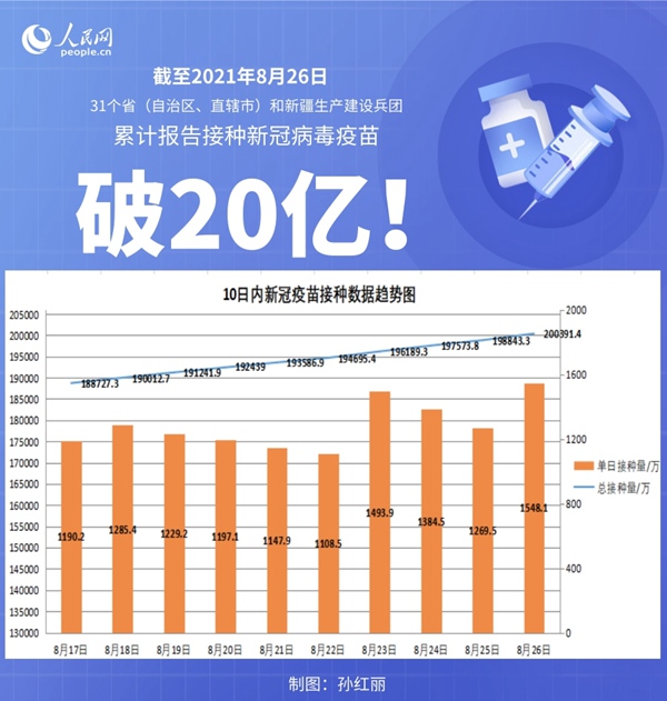 全國累計接種新冠病毒疫苗超20億劑次 完成全程接種88943.9萬人
