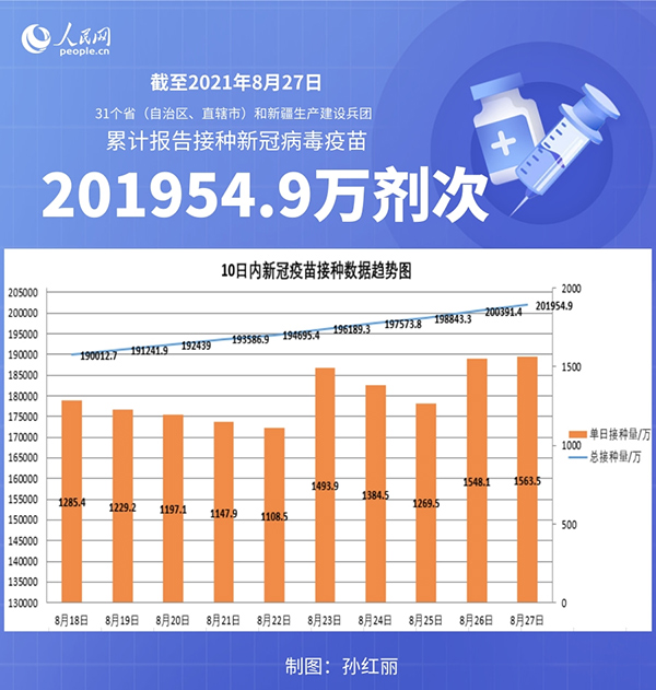 人民網(wǎng)北京8月28日電 (記者孫紅麗)據(jù)國(guó)家衛(wèi)生健康委官網(wǎng)消息,截至2021年8月27日,31個(gè)省(自治區(qū)、直轄市)和新疆生產(chǎn)建設(shè)兵團(tuán)累計(jì)報(bào)告接種新冠病毒疫苗201954.9萬(wàn)劑次。