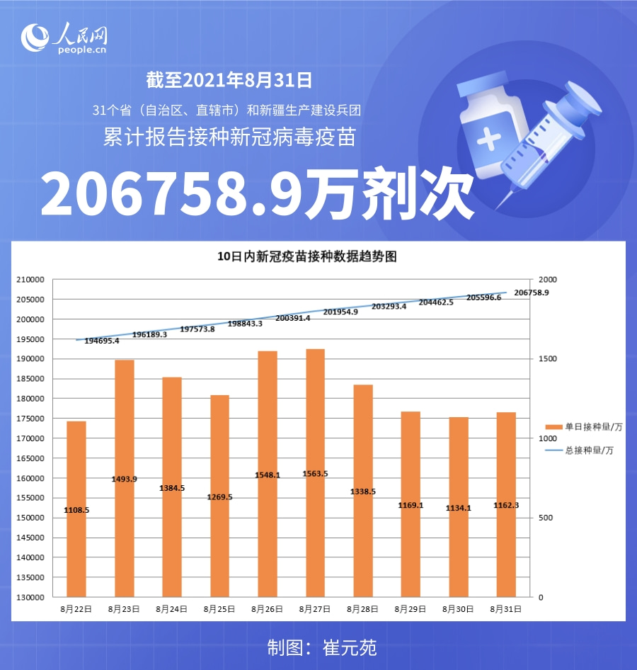人民網北京9月1日電 (記者崔元苑)據國家衛生健康委官網消息,截至2021年8月31日,31個省(自治區、直轄市)和新疆生產建設兵團累計報告接種新冠病毒疫苗206758.9萬劑次。