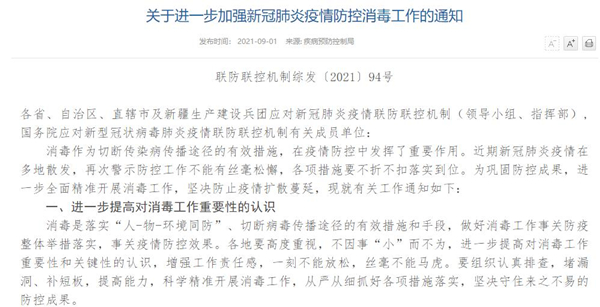 人民網北京9月2日電 (記者張文婷)消毒作為切斷傳染病傳播途徑的有效措施,在疫情防控中發揮了重要作用。近期新冠肺炎疫情在多地散發,再次警示防控工作不能有絲毫松懈,各項措施要不折不扣落實到位。為鞏固防控成果,進一步全面精準開展消毒工作,堅決防止疫情擴散蔓延,近日,聯防聯控機制綜合組發布《關于進一步加強新冠肺炎疫情防控消毒工作的通知》(以下簡稱《通知》)指出,消毒是落實“人-物-環境同防”、切斷病毒傳播途徑的有效措施和手段,各地要高度重視,不因事“小”而不為,進一步提高對消毒工作重要性和關鍵性的認識,增強工作責任感,一刻不能放松,絲毫不能馬虎。