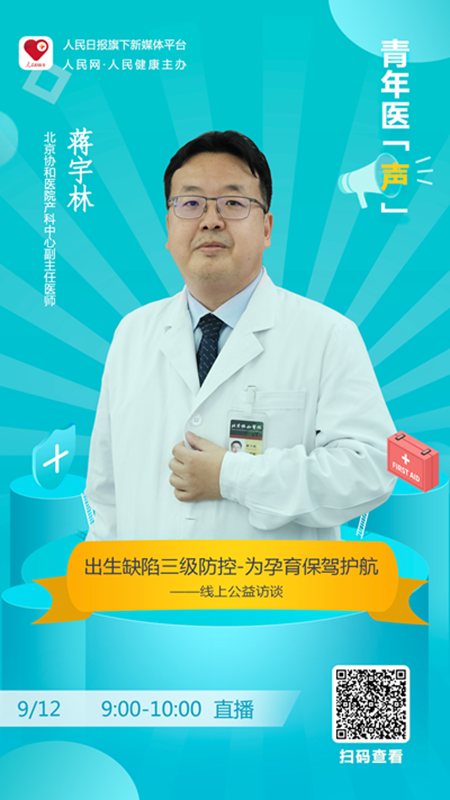 9月12日9:00-10:00,“人民好醫生”客戶端將邀請北京協和醫院產科中心副主任醫師蔣宇林做客“青年醫‘聲’”欄目,為大家詳細講解出生缺陷三級防控的相關知識,千萬不要錯過。